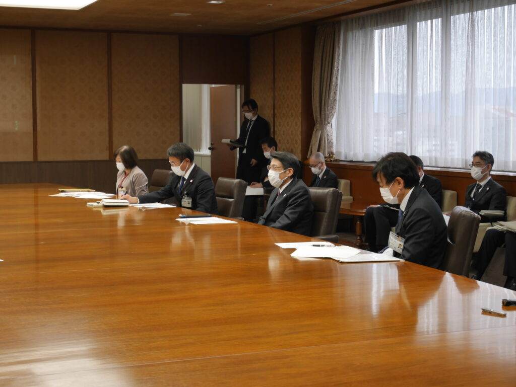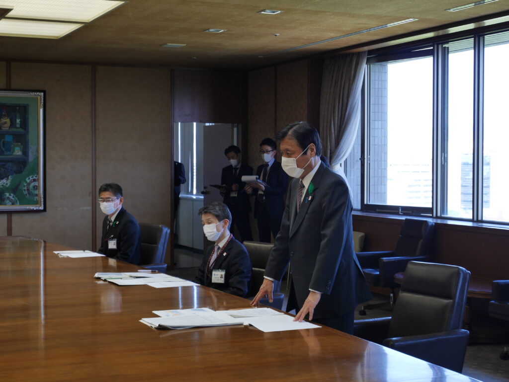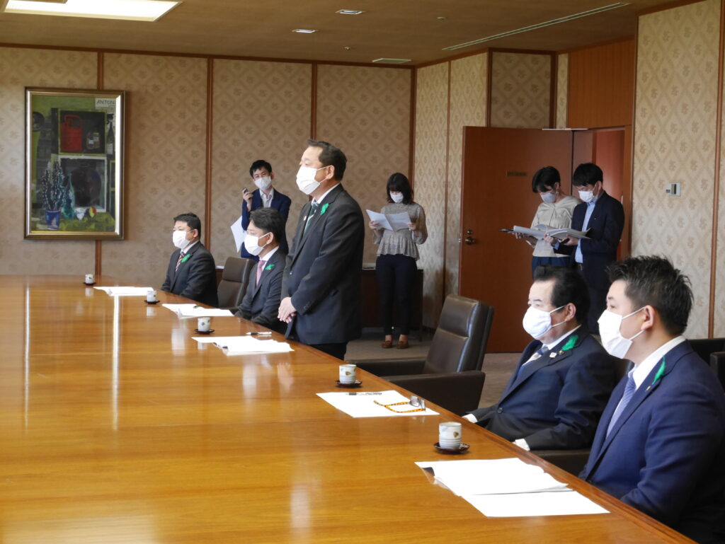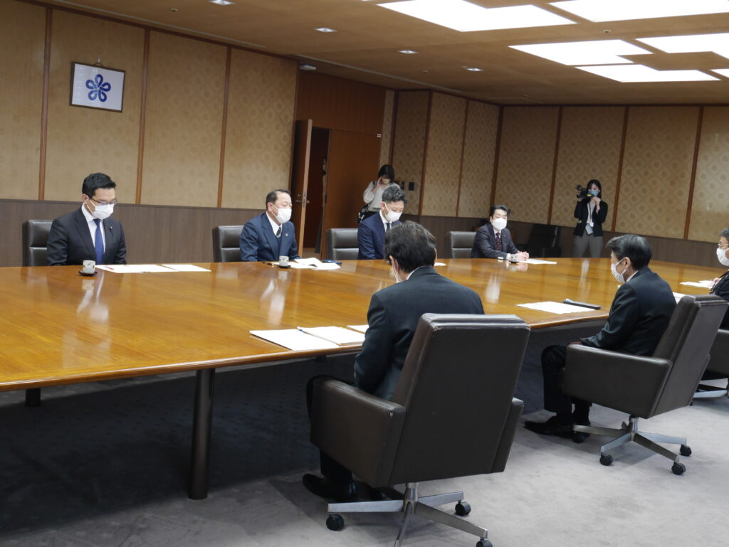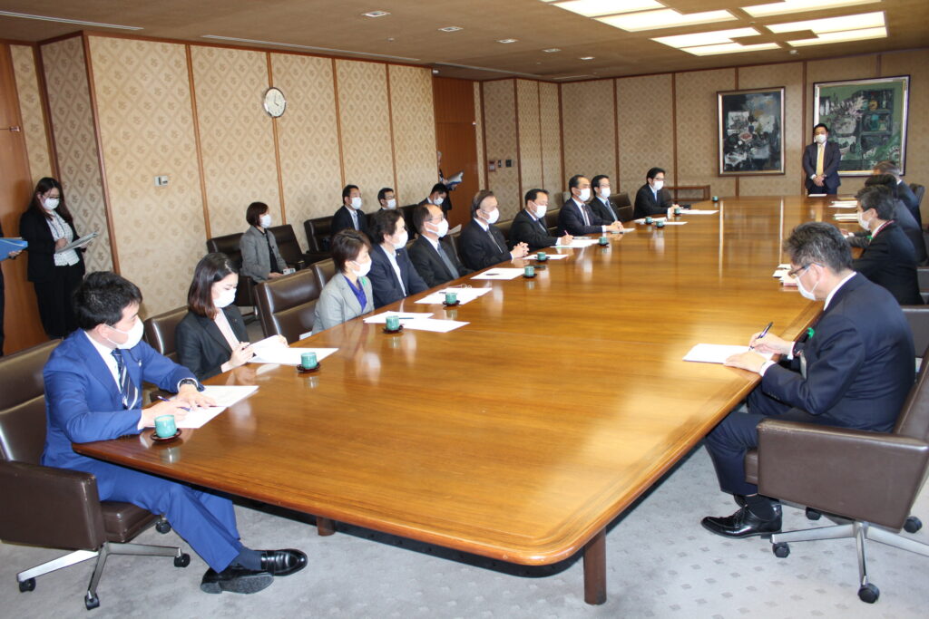 要請は、密を避けるため、岩元会長、大橋幹事長、井上政策審議会会長、佐々木允政策審議会事務局長の4名で行いました。