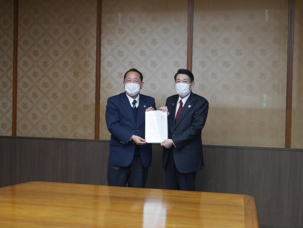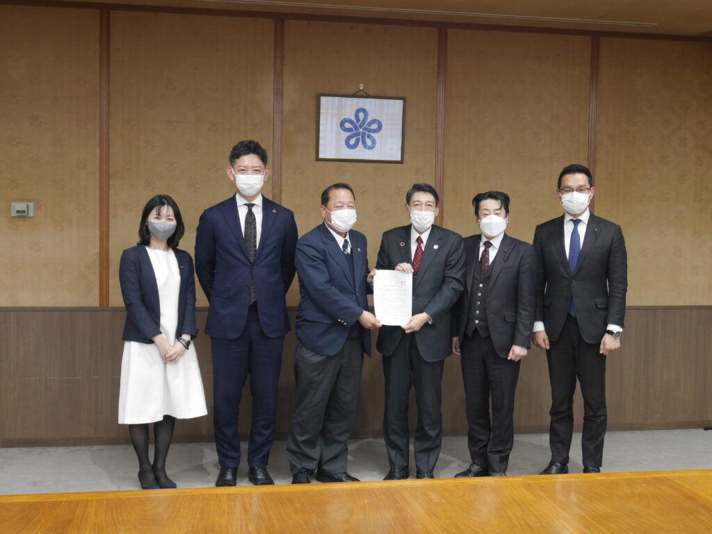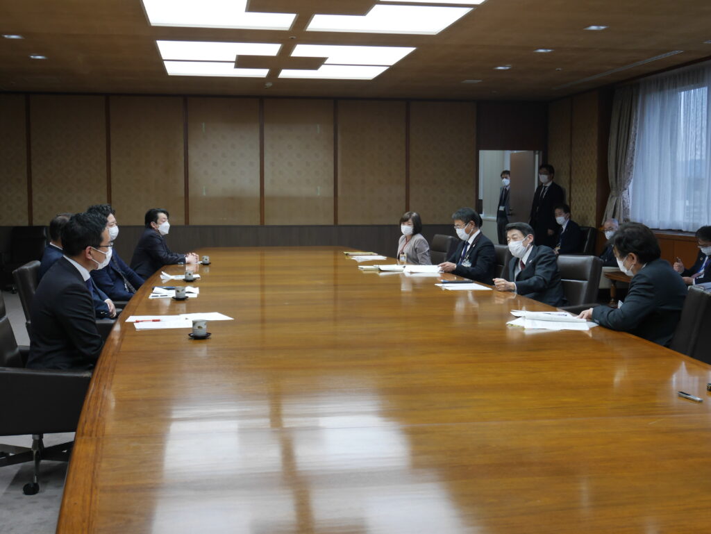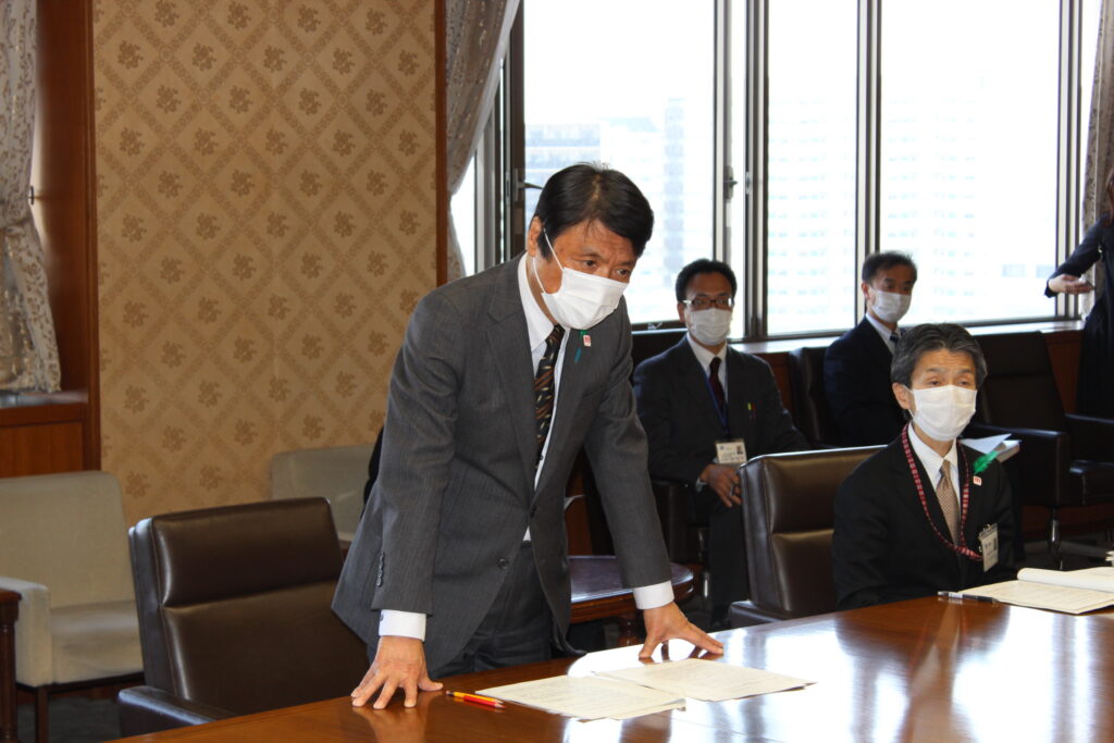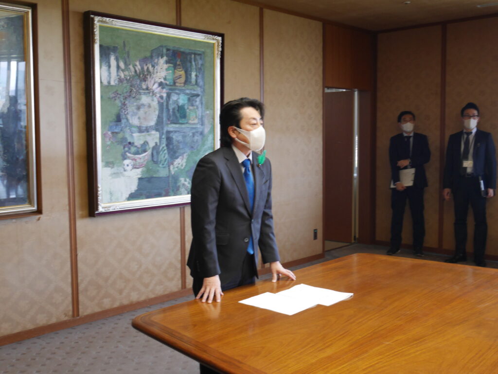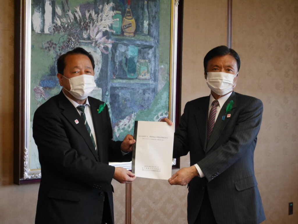 要請は、密を避けるため、岩元会長、大橋幹事長、井上政策審議会会長、佐々木允政策審議会事務局長の4名で行いました。