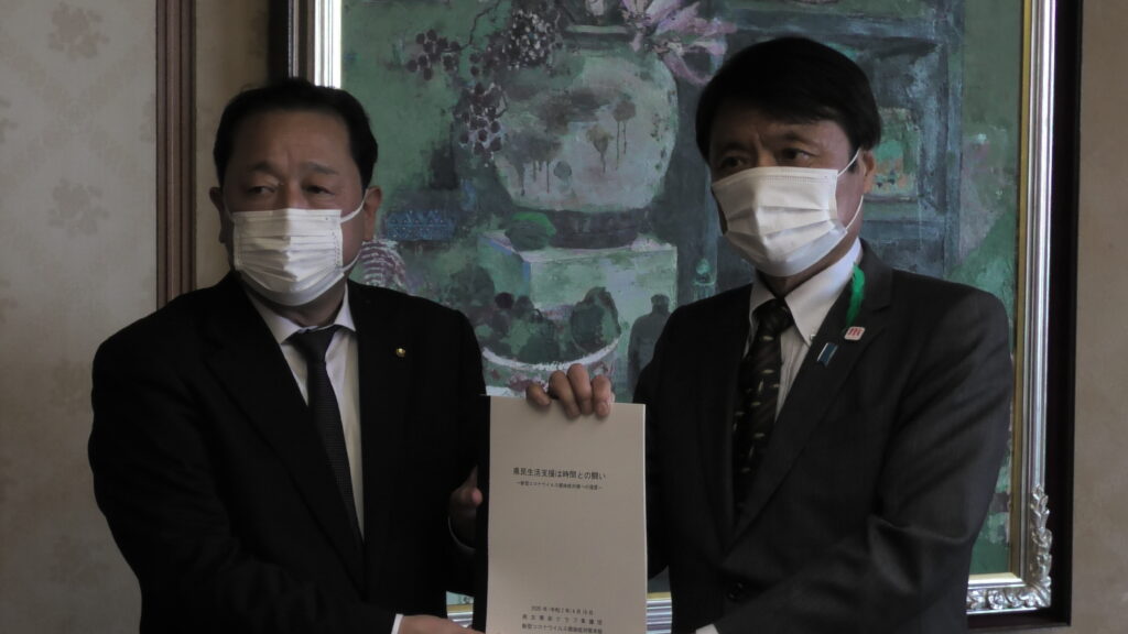 緊急事態宣言解除が決定される前の5月12日、民主県政クラブ県議団は、岩元会長をはじめ6名の議員による「提言書(第2弾)」を知事に手渡し、出口戦略を図るとともに、感染拡大の第二波に備えること、県民の生活、企業の事業存続を強く訴えたところです。