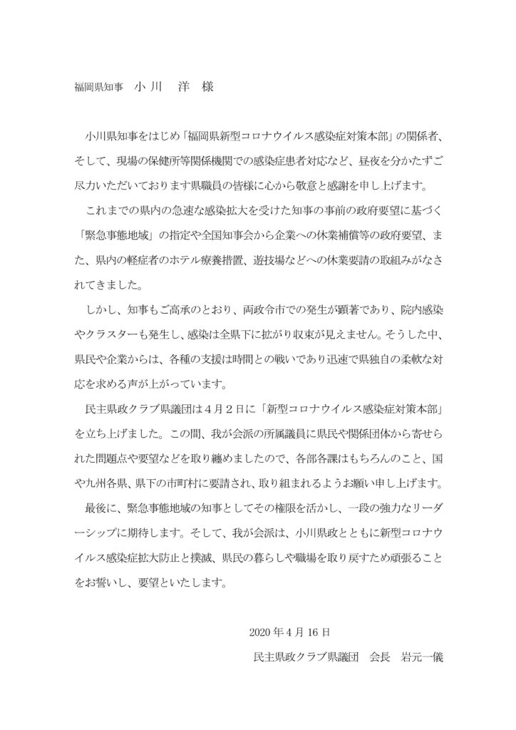 民主県政クラブ県議団では、4月16日に小川福岡県知事に対し、県民の生活を守るため「県民生活支援は時間との闘い」と題する緊急提言を行いました。