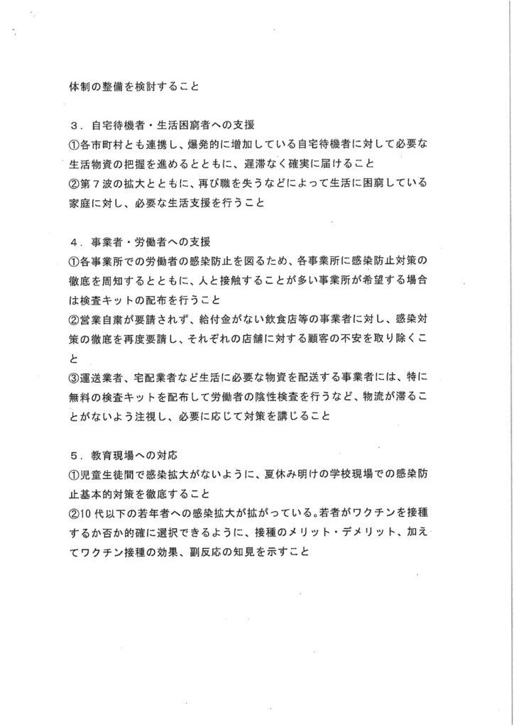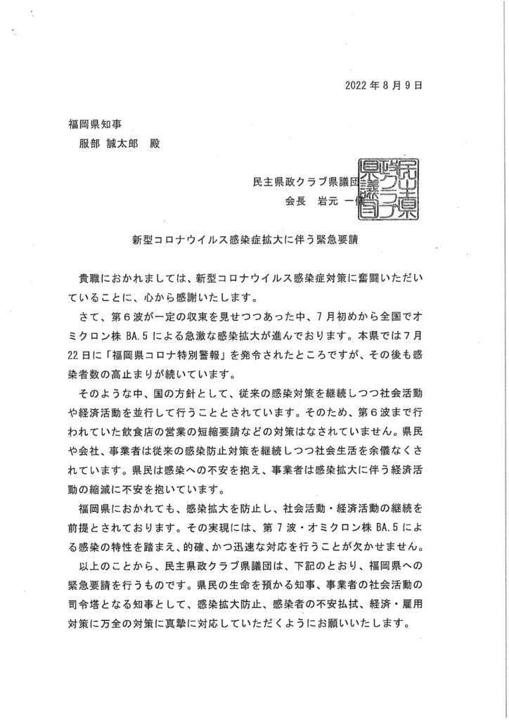 2022年8月9日、新型コロナ感染症対策に関する知事への緊急要請