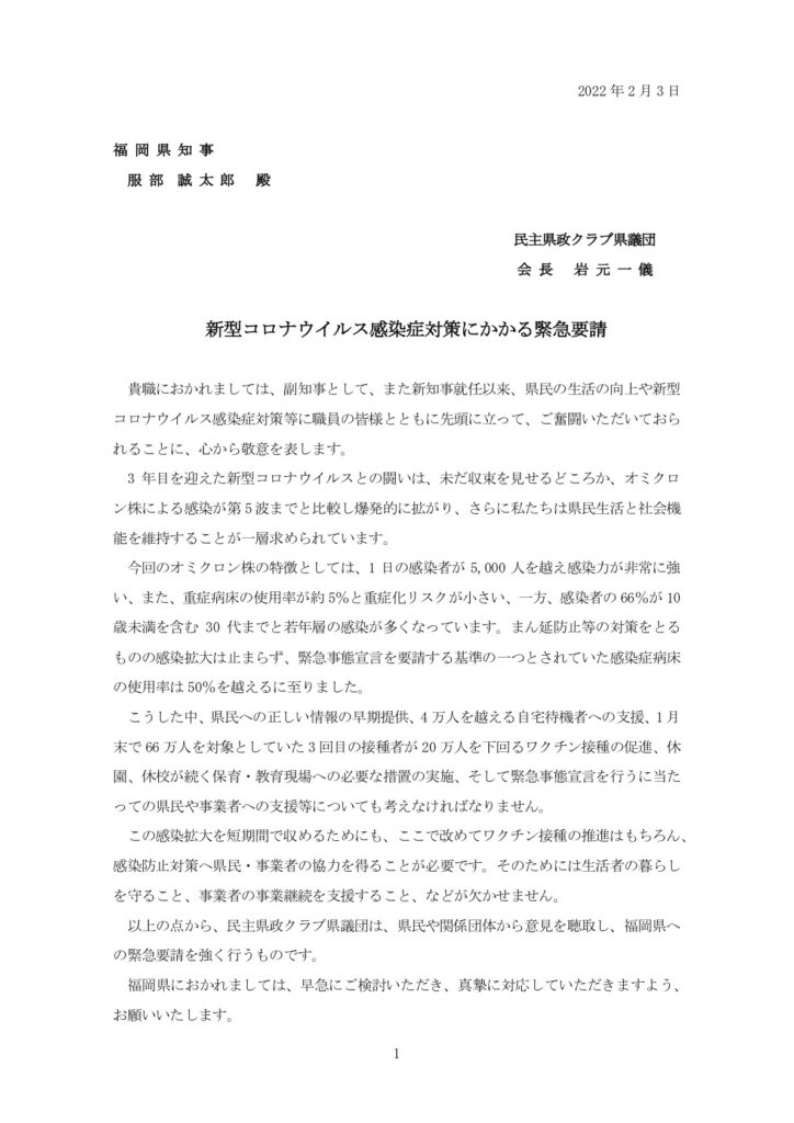 2022年2月3日、服部福岡県知事へ新型コロナ対策を緊急要請